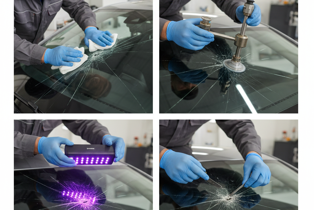 Preparation: To get rid of any glass shards, debris, or dampness, the technician carefully cleans the injured area. Any material left behind might weaken the resin’s binding, so this is an important step.